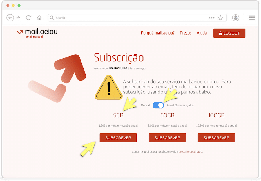 Escolha o período da subscrição (anual ou mensal), o aumento de espaço desejado (5GB, 50GB ou 100GB) e clique em “Subscrever“.