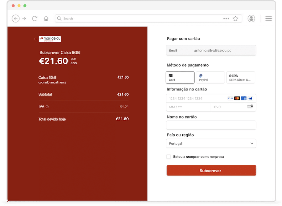 Será encaminhado para a página de check-out da Stripe (parceiro do Webmail Clix para gerir as subscrições) onde pode escolher o meio de pagamento com que se sentir mais confortável.