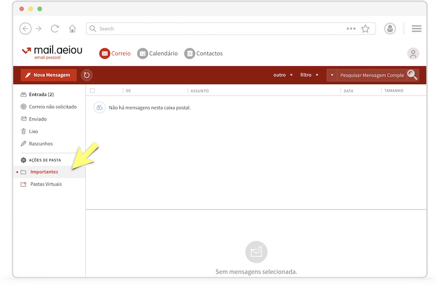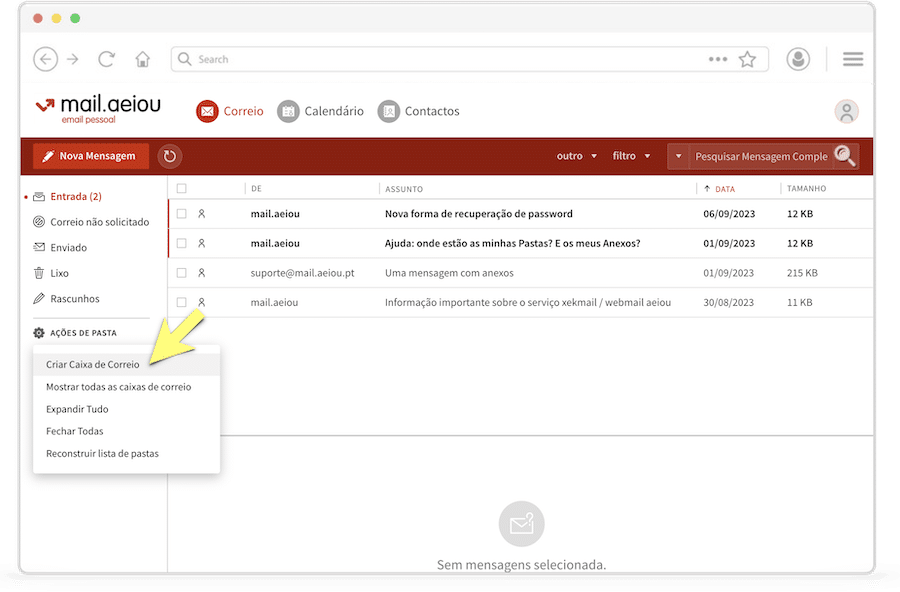 Na sua Caixa de Correio, na opção “Ações de Pasta” no menu à esquerda, selecione a opção “Criar Caixa de Correio“. Dê à nova pasta um nome a seu gosto — por exemplo, “Importantes”.