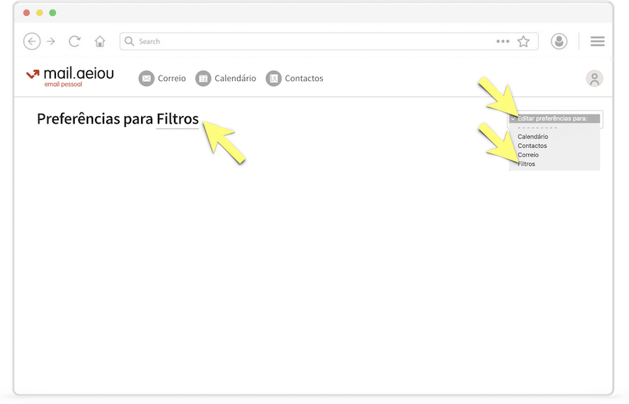 Seguidamente, clique no menu “Editar Preferências para:” no canto superior direito e escolha a opção “Filtros”.