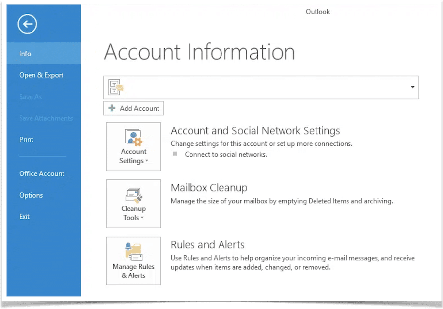 Pode saltar este passo se está a configurar a primeira conta de Outlook, porque este inicia automaticamente a configuração de conta quando iniciar a aplicação. Se for a segunda conta, precisa de aceder ao menu File | Info, e clicar no botão “Add Account”. Salte para o passo 4.
