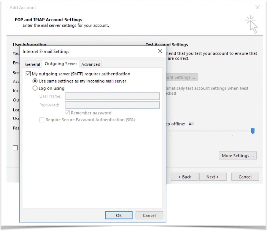Escolha a tab Outgoing Server, e ligue a opção “My outgoing server (SMTP) requires authentication.