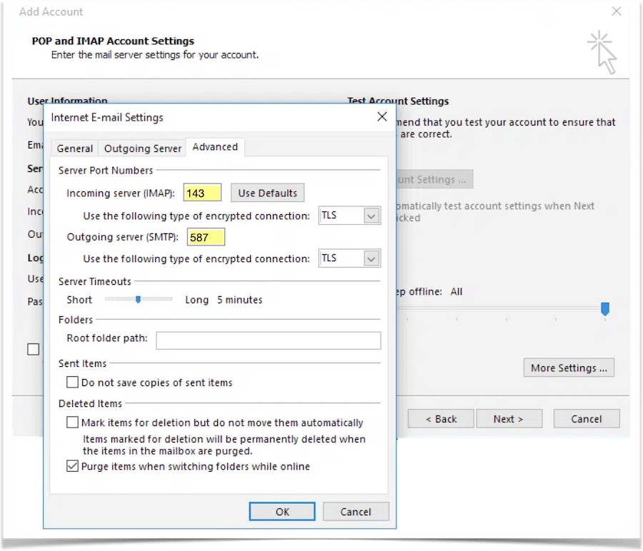 - Porta do servidor de saída: 587 (o Outlook preenche 25, por omissão)