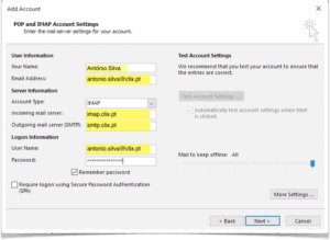 - Servidor de recepção / Incoming mail server: imap.clix.pt