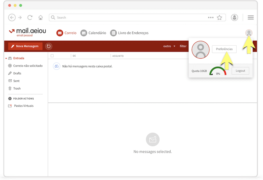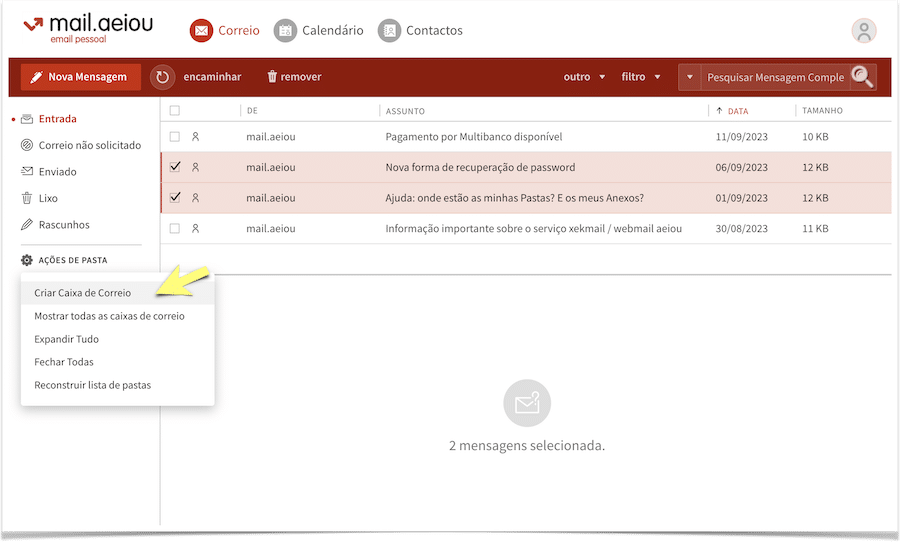 Se quiser arquivar as suas mensagens em pastas personalizadas, pode criar pastas na opção “Criar Caixa de Correio” no botão “Ações de Pasta” na barra lateral à esquerda.