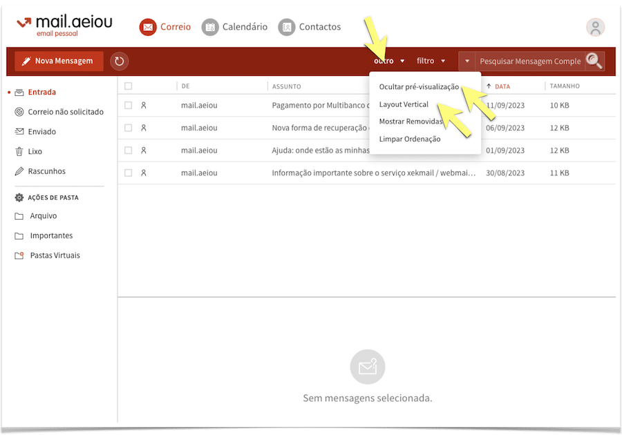 O novo Webmail Clix tem 3 opções de pré-visualização de mensagens: com o painel dividido horizontalmente, com o painel dividido verticalmente, e sem pre-visualização.