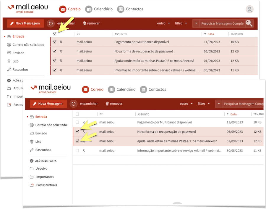 Na sua lista de mensagens, pode selecionar todas as mensagens, ou várias várias mensagens ao mesmo tempo, por exemplo para as apagar ou mover para outra pasta.