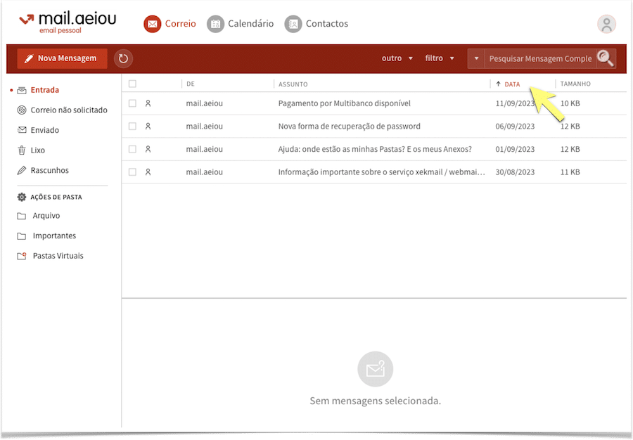 Por omissão, o novo Webmail Clix ordena as mensagens nas caixas de correio por ordem da mais antiga para a mais recente (com as mais antigas no topo).