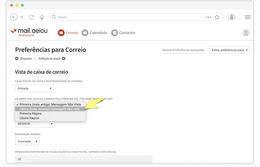 Para alterar esta opção de modo a que fique selecionada a primeira mensagem (a mais recente das não vistas) proceda por favor a seguinte forma: