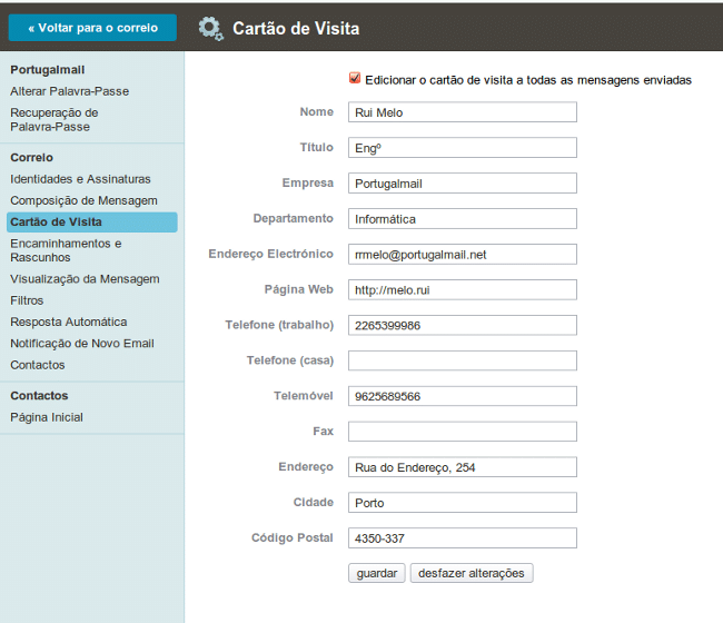 Se desejar, poderá também acrescentar o Cartão de Visita aos seus emails, assinalando com um sinal de visto a opção Adicionar o Cartão de Visita a todas as mensagens enviadas.